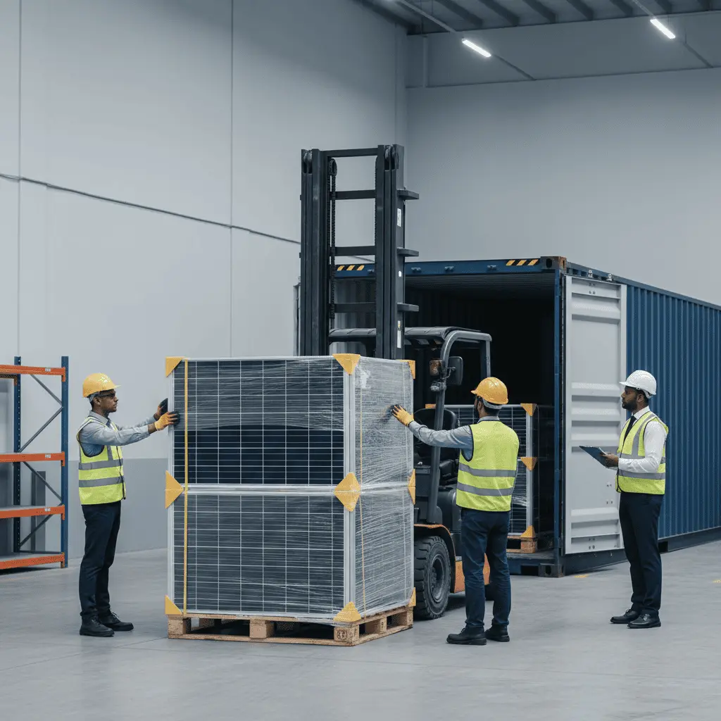 Módulos por pallets con opción de inversores y accesorios; certificaciones IEC/UL y embalaje reforzado.